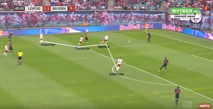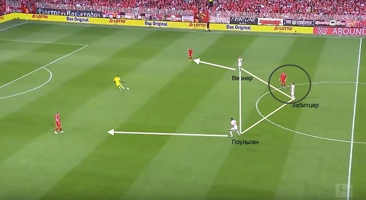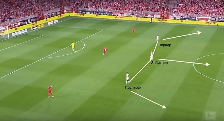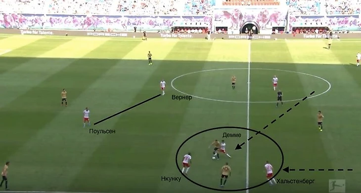 Атака выстраивается треугольником. Вернер и Поульсен прессингуют центрбеков и перекрывают продвижение мяча по центру (Забитцер их страхует). Форварды вынуждают соперника пасовать на фланг, где крайние защитники «РБ» (Клостерманн или Хальстенберг) при помощи выдвинувшихся на фланг полузащитников (на рисунке ниже – Нкунку и Демме) создают численное преимущество.