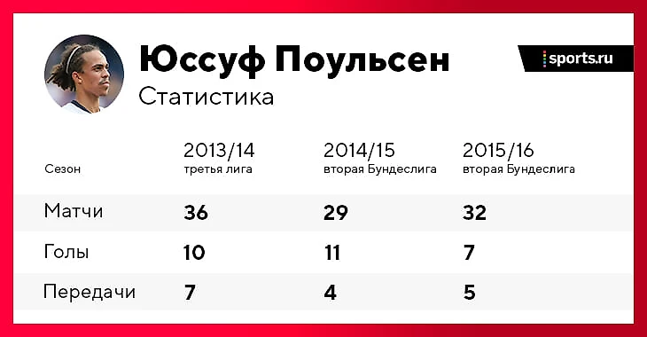 «Лейпциг» с Юссуфом в составе за три года пролетел два дивизиона и в 2016-м вышел в элиту. Поульсен отмечал зверскую интенсивность немецких тренировок, после которых он первые несколько дней не мог ходить. Занятия с ментальным коучем, которого приставил к нему клуб, тоже пошли на пользу. Почувствовавший уверенность датчанин за это время стал лучшим бомбардиром клуба (сезон-14/15) и получил вызов в национальную сборную.