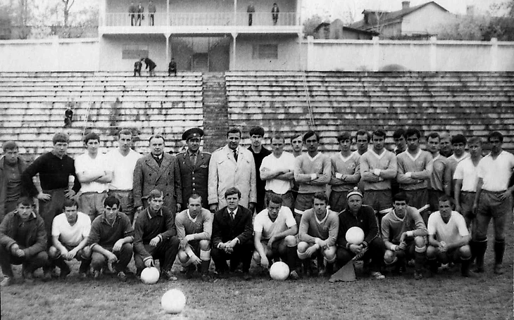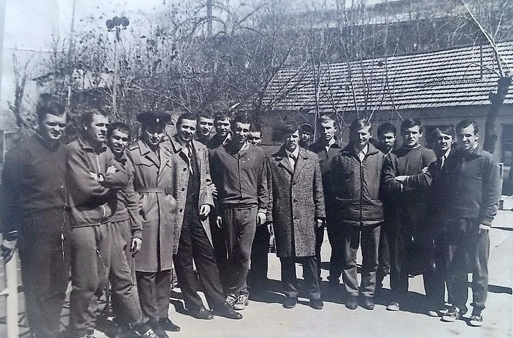 Лев Иванович Яшин (пятый слева) и футболисты хабаровского СКА на весенних предсезонных сборах на юге страны