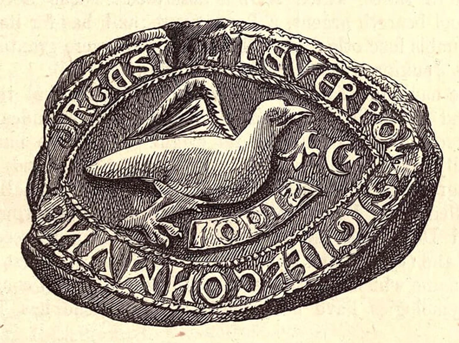 Иоанн Безземельный правил Англией с 1199 года до самой смерти в 1216-м. В 1207 году он основал город-порт Ливерпуль ради контроля Ирландского моря и для удобства переправки войск в Ирландию. В качестве официальной печати город использовал печать самого короля, на которой изображен орел, держащий в клюве ветку. Это первое изображение мифической птицы.