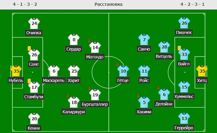 Сане – 7,5. Один из лучших на поле, успешно вел борьбу везде, попал в перекладину чужих ворот.