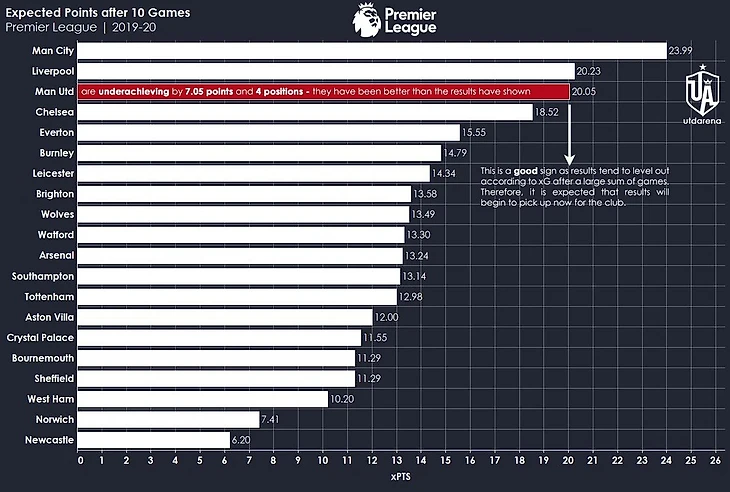Дискретное значение подразумевает собой конечное число вероятностей, тем не менее довольно часто случаются матчи, после которых сложно сказать однозначно, что одна команда была явно сильнее другой. Поэтому для моделей, оценивающих качество игры команды, необходимо брать математическое ожидание величины, а не конкретное значение из множества выше. Оценив разницу реальных очков и xPoints, можно сделать выводы об удаче, сопутствующей команде, и понять, какие команды явно прыгают выше головы, а какие, наоборот, не реализуют свои шансы должным образом.