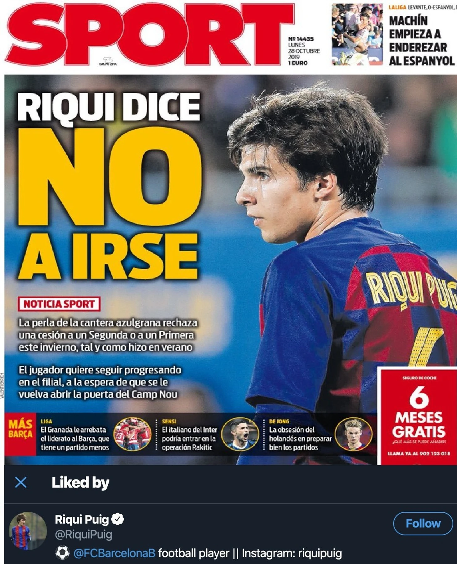 Несмотря на все препятствия на его пути к первой команде «Барселоны», Рики стоит на своем и в очередной раз подтвердил, что не собирается отправляться в аренду в какой бы то ни было клуб. Каталонский Sport.es опубликовал вчера обложку, на которой изображен Пуч, с подписью «Рики не собирается уходить», и сам каталонец некоторое время спустя отметил этот твит функцией «нравится».