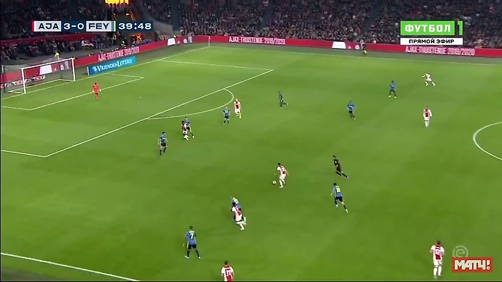 На второй минуте Карсдорп зачем то выбросился из зоны, это заметил Промес и получил отличную передачу от Тальяфико, дальше "Аякс" разрывает в штрафной- счёт открыт. Через пять минут все тот же Аргентинец откликнулся в штрафной на передачу от Нереса - забегание проспал Нарсинх, добежавший со своим игроком до линии штрафной, но выключившийся в решающий момент. Такое начало нисколько не смущает хозяев - они продолжают владеть мячом, Промес и затем Тадич прощают соперника, не реализуя выходы один-на-один. Мы видели в этот вечер привычный "Аякс" - высокий прессинг, легковесная группа нападения ( это скорее выбор на конкретный матч, но она тоже часто встречается ), насыщение центральной зоны при владении, классные розыгрыши. У команды есть свой почерк, даже выход Ван Де Бека в опорной зоне ( привычная позиция скорее выше - десятка) не помешал показать класс. Что же придумал "Фейеноорд"? Ничем не удивил. Играя вторым номером команда не преуспела ни в защите, ни в организации контратак. В непродолжительный отрезок своего владения команды не могла даже дойти до финальной трети соперника, можно выделить лишь атаку на двадцать девятой минуте, когда Хапс остался один на линии штрафной и бил после передачи Карсдорпа, но попал в игрока хозяев. В заключительные десять минут залетает ещё два и ни о чем говорить уже не приходиться. Можно выделить четвертый гол как апофеоз всей игры "Фейеноорда" в первом тайме - посмотрите, какой разрыв в центре при обороне, Тадич спокойно тащит мяч и атака доводится до верного.