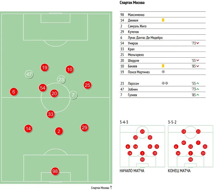 Тедеско очень любит менять схемы прямо по ходу игры, но для перестроения ему нужен ключевой игрок, который будет менять позицию, а вместе с ней — и весь рисунок. В «Шальке» это был Горецка, который то опускался в опорную зону к Майеру, то рвал вперед и подключался к атакам вторым темпом. В «Спартаке» им может стать Умяров, барражирующий между зоной Крала и левым полуфлангом. Это поможет быстро переходить с защитной схемы с двумя опорниками на атакующую модель, а также снимет нагрузку при игре в обороне с Зелимхана Бакаева, открывая ему свободную роль в нападении. То, как Шюррле опускается вниз, а Бакаев уходит вперед, видно на схеме с усредненными позициями в матче с «Локомотивом». От этого меняется и роль Умярова.