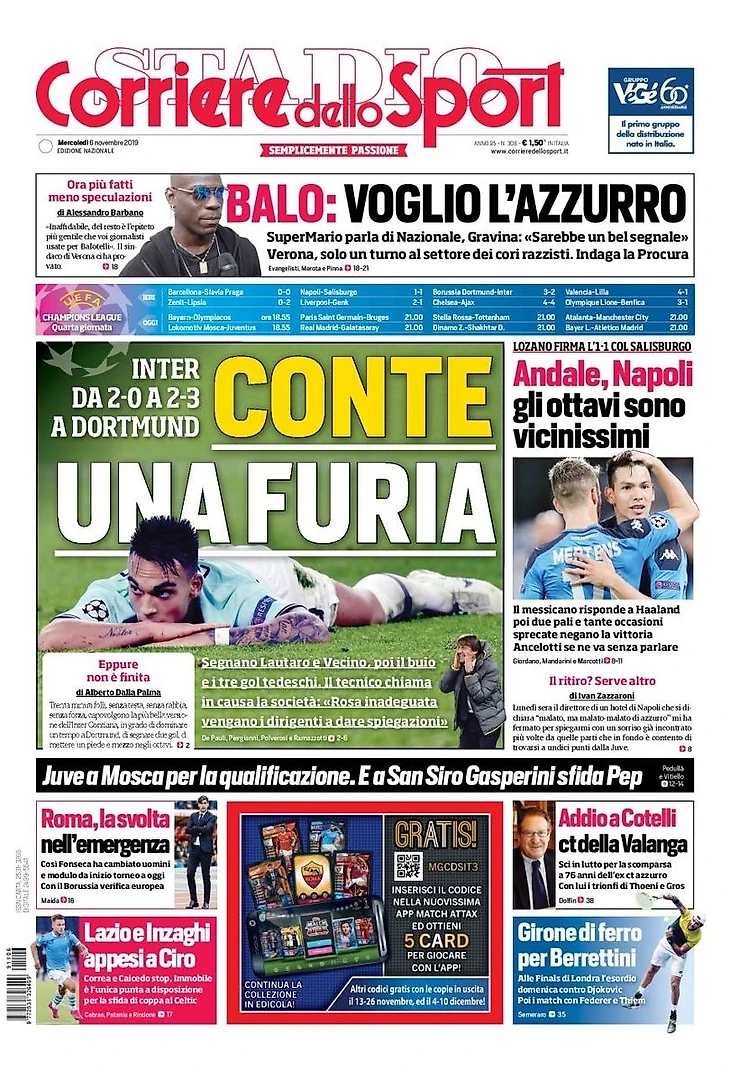 «Интер» с 2:0 к 2:3 в Дортмунде. Забили Лаутаро и Весино, затем выключились и получили три гола от немцев. Тренер обвиняет в проблемах клуб: «Команда неадекватна, пусть приходят менеджеры, чтобы дать объяснение».