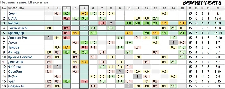 Ростов - самая результативная команда лиги (средний тотал 3,4, ТБ2,5 в 12 из 15 матчей). Краснодар также склонен к "верховому" футболу. Однако самая интересная тенденция у этих команд находится в разрезе первого тайма: