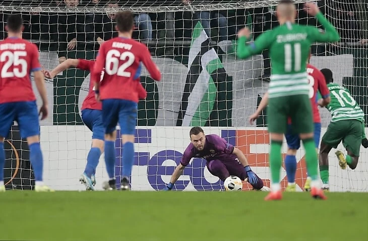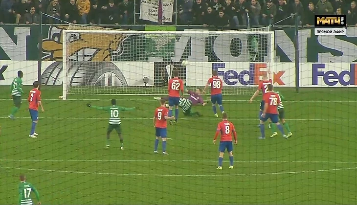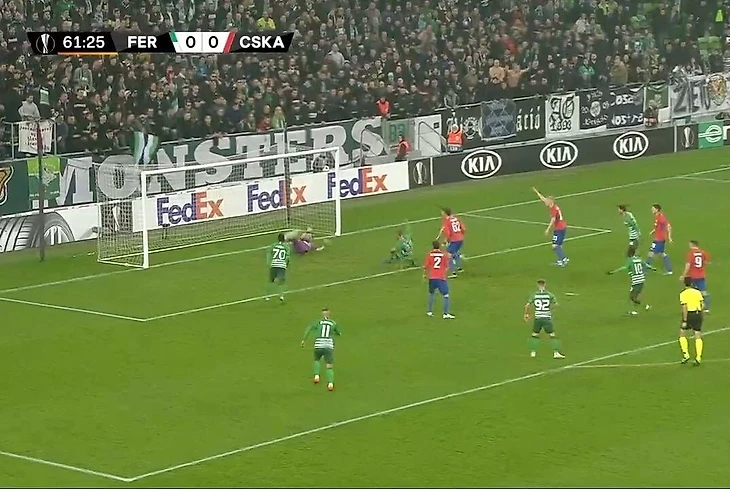 Игрок «Ференцвароша» навесил со штрафного, и у ворот ЦСКА возник переполох: защитники заблокировали три удара, но мяч все равно нагло отскочил к полузащитнику Харатину, который находился в трех метрах от Акинфеева (обратите внимание на видео, что вратарь уже завалился в левый угол).