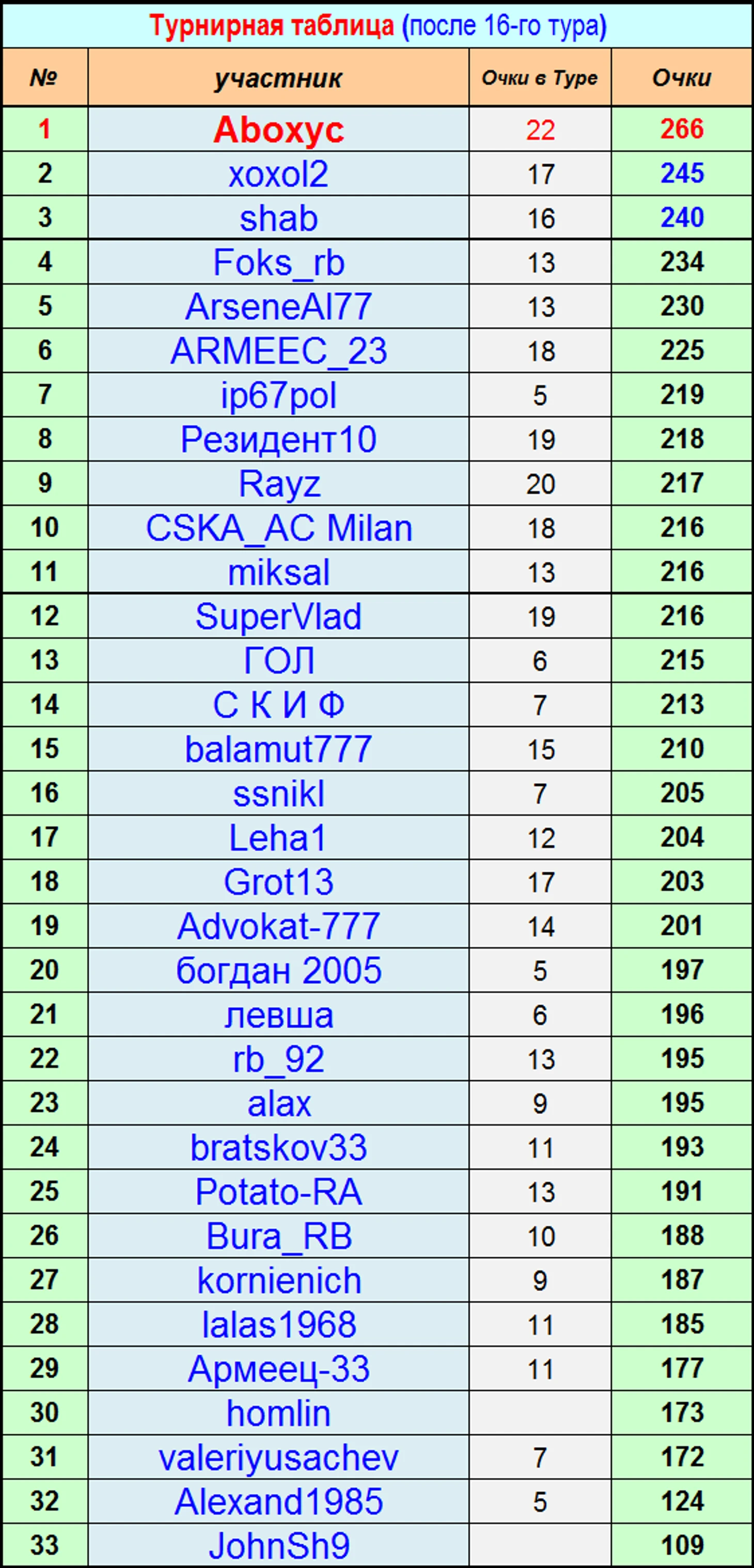 Привет Всем! Подводим итоги 16 тура прогнозных турниров в Лиге РА :