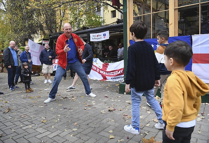 На выезд приехали около 1000 английских фанатов. Изначально им планировали наливать бесплатно, но не сложилось. Официантам в районе стадиона выдали специальные футболки. На кафе в 500 метрах от стадиона висит баннер «Добро пожаловать, братья!» с фотографиями Стерлинга, Кейна и Делфа.