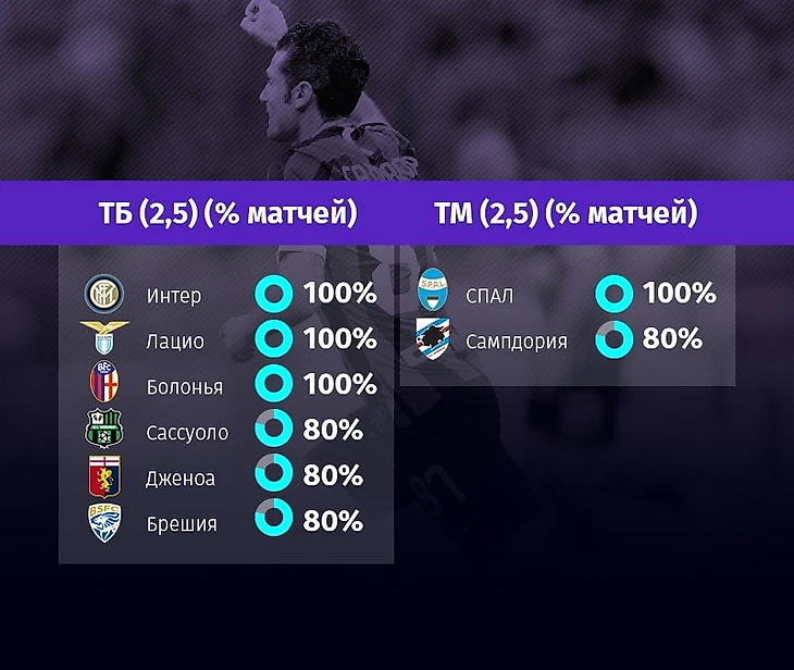 «Интер», «Болонья», «Лацио» и «Дженоа» присутствуют в обеих голевых таблицах. «Фиорентина» и «Лечче» показали неплохой результат по маркету за последний месяц (в чемпионате по девять игр на «обе забьют»). У «Болоньи» и «Дженоа» такие же цифры.