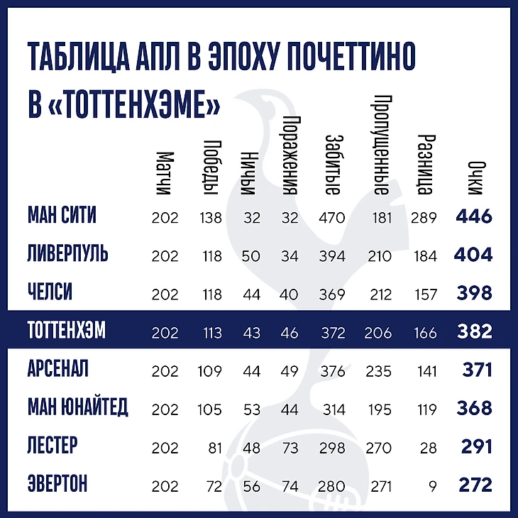 293 матча во всех турнирах – четвертый тренерский результат в истории «Тоттенхэма». 202 из них Почеттино провел в АПЛ – вот как выглядит общая таблица за это время: