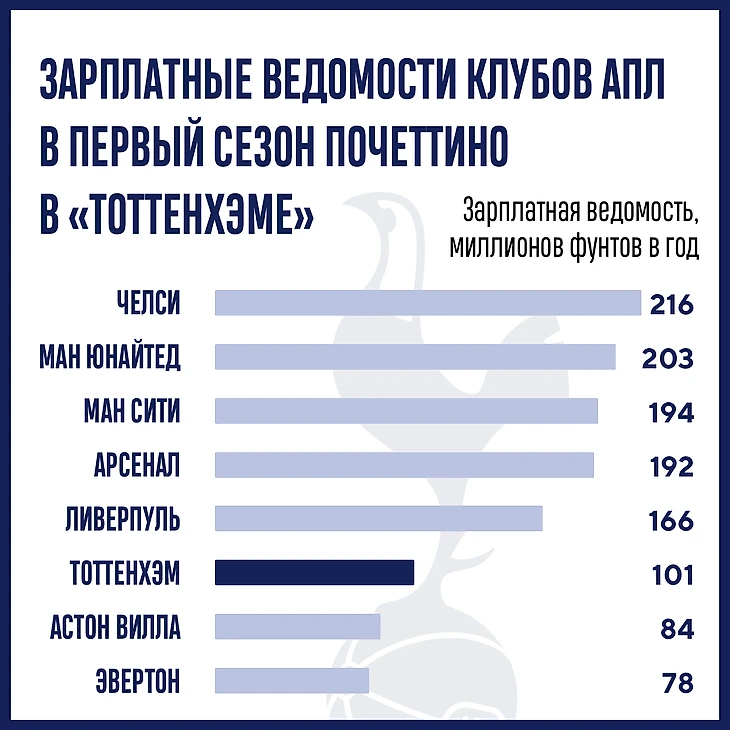 Оцените стартовую точку Маурисио, сравнив зарплатные ведомости клубов в первом лондонском сезоне аргентинца. «Тоттенхэм» был ближе к «Астон Вилле» (!) и «Эвертону», чем к топам.