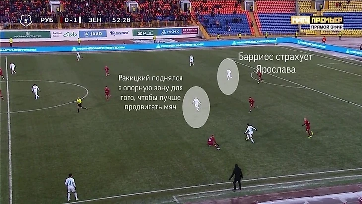 2. С 60 по 70 минуту: Вынужденная замена Данченко, хозяева перестраиваются в 4 защитника. «Зенит» не успевает своевременно возвращаться на исходные позиции после атаки, возникают дыры в обороне. Рубин проводит отличный отрезок в плане атакующих действий;
