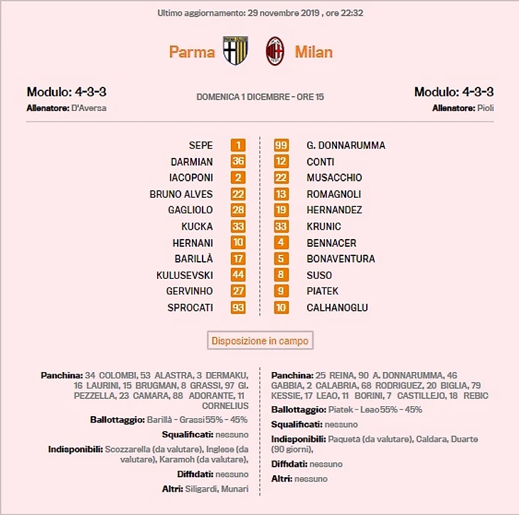 La Gazzetta dello Sport: Ориентировочные составы команд на матч 14-ого тура Серии А «Парма» - «Милан»