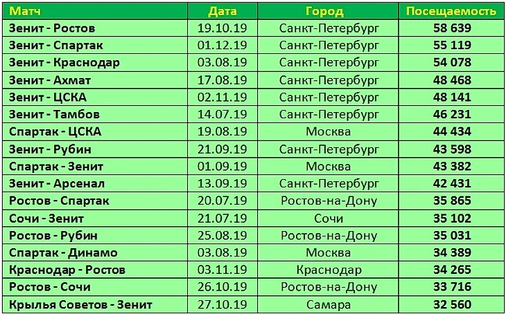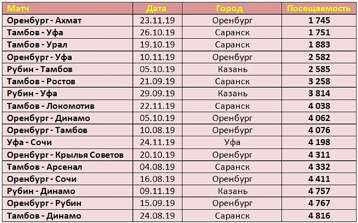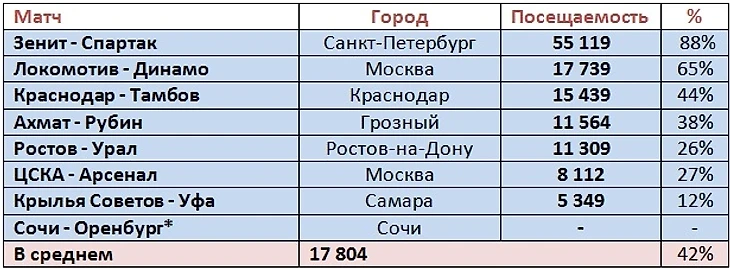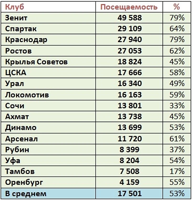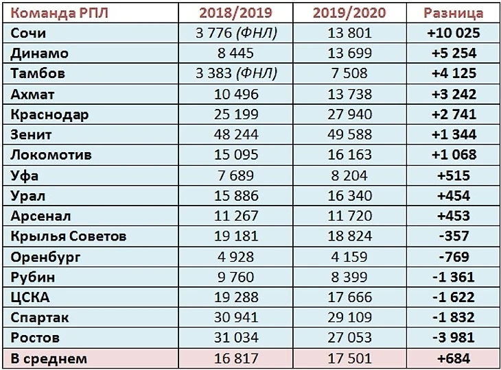 Средняя домашняя посещаемость клубов РПЛ, после 18 тура: