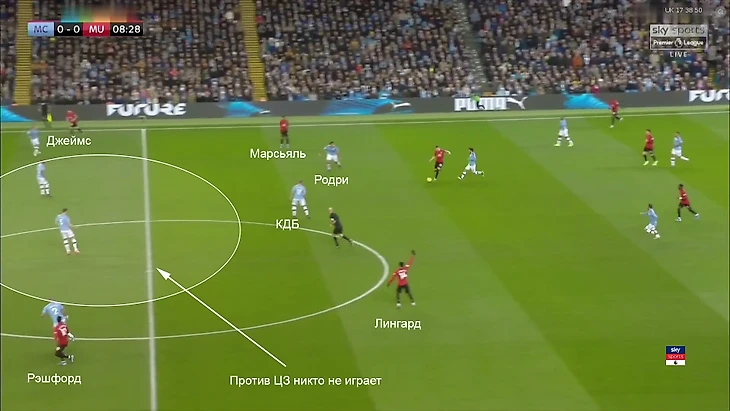 Это максимально умышленное и максимально неудобное для соперника расположение. Центральные защитники не могут пойти в эти зоны за Марсьялем и Лингардом. Крайние не могут взять их на себя, потому что их умышленно держат Рэшфорд и Джеймс. КДБ и Родри теперь не могут поддерживать прессинг выше. Более того, они вынуждены растягиваться, а не держаться близко друг к другу.