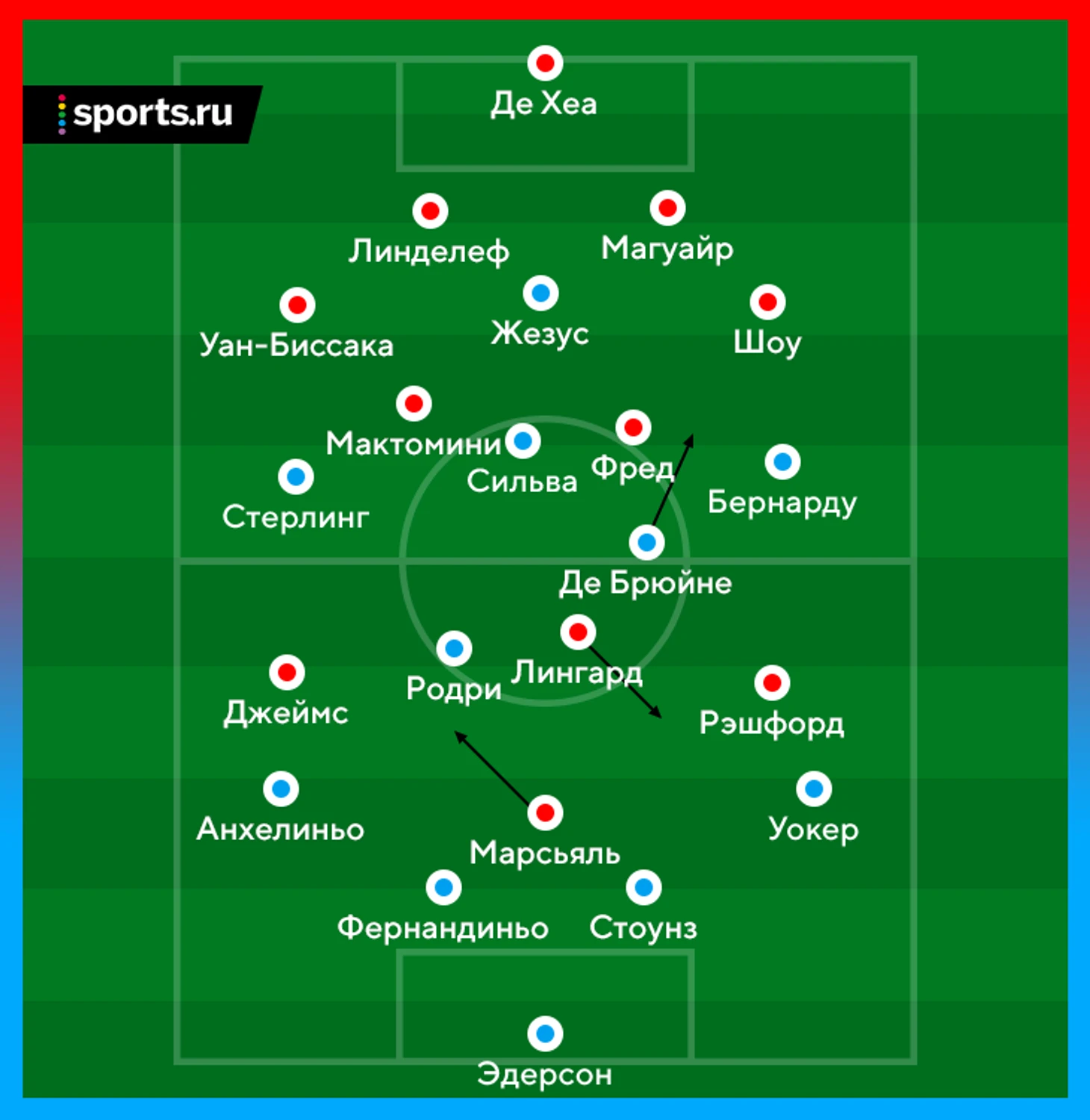 При стандартном расположении игроков (в нем Лингард под Марсьялем, а вингеры свободно двигают и смещаются) «Сити» было бы намного проще. КДБ чаще выдвигался бы в прессинг. Не возникало бы таких разрывов: