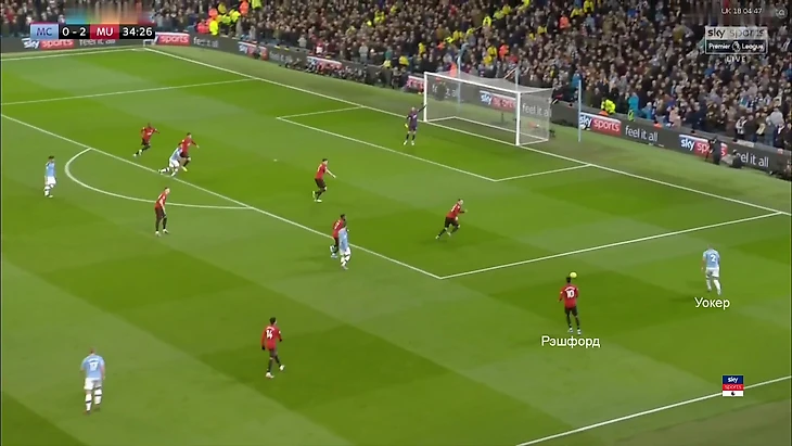 Марсьяль и Лингард опускаются и растягивают позиции Де Брюйне и Родри. А Рэшфорд и Джеймс строго держат ширину: