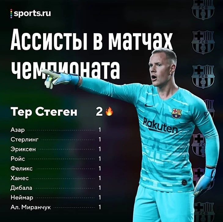Многофункциональность тер Стегена восхищает. Это уже второй ассист вратаря «сине-гранатовых» в текущем сезоне. По этому показателю он обходит многих топовых нападающих Европы. И является единственным вратарем с двумя голевыми передачами среди топ-5 лиг.