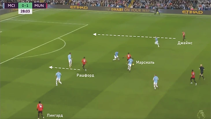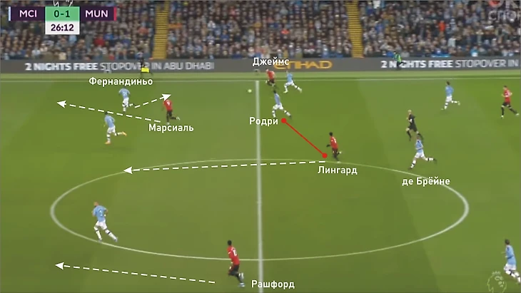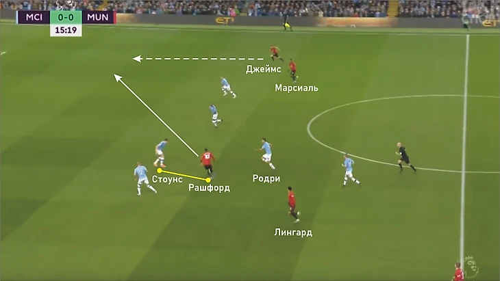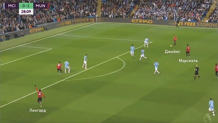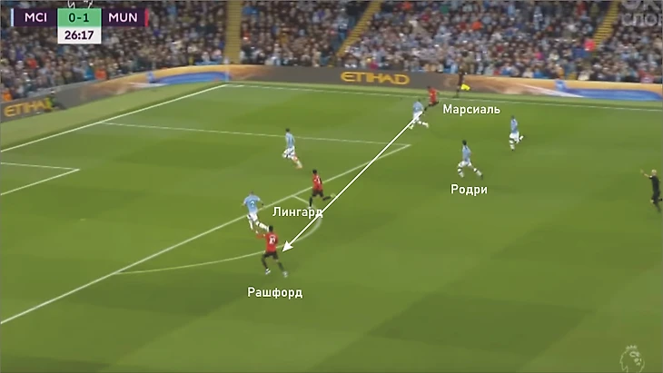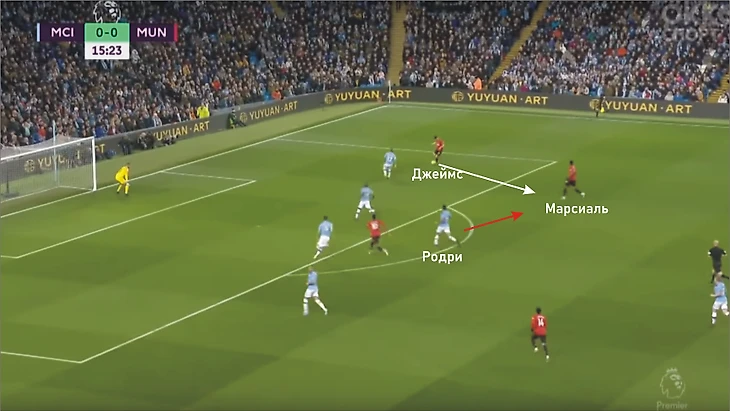 Марсиаль, получив мяч от Джеймса, имеет вариант и с Лингардом, и с Рашфордом. Родри вновь отыгран и фактически не мешает атаке гостей.