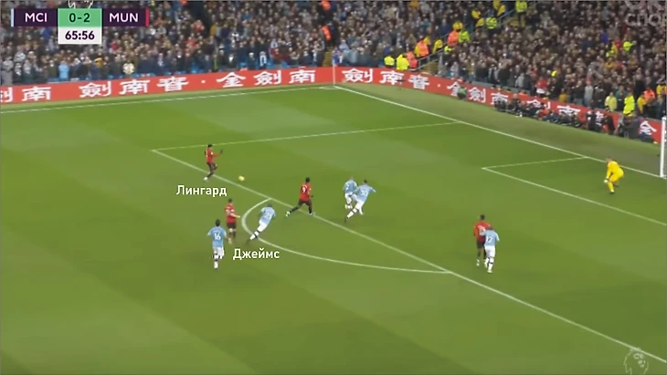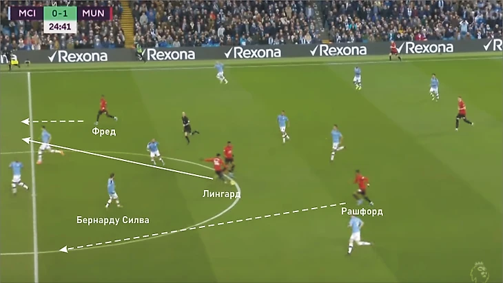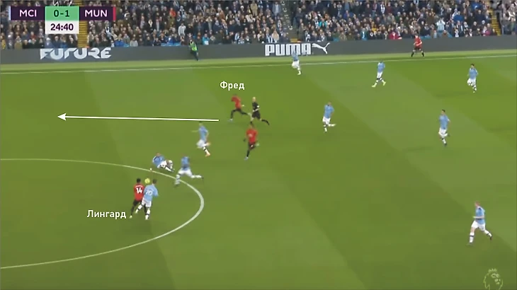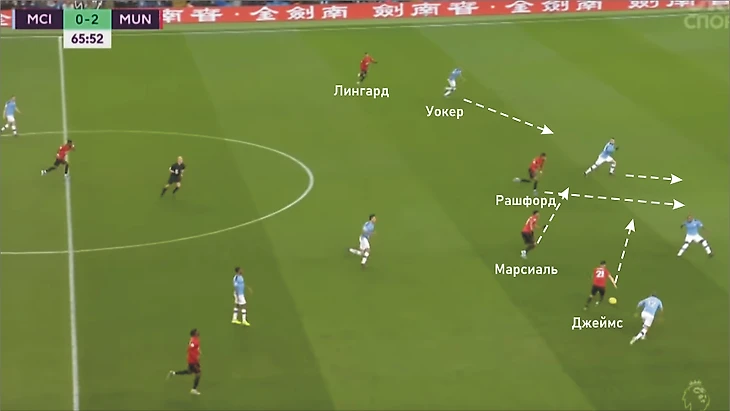 Следующий момент. Джеймс идёт по флангу. Хотя, видя, как двигается Джеймс, "идёт" можно сказать про Марио Фернандеса или Бакаева, но не про Джеймса. Ошибку допускает Фернандиньо, пошедший на мяч и неверно оценивший скорость Джеймса. Марсиаль сразу уходит в зону левого защитника. Рашфорд поддерживает атаку с правого фланга, забегая за спину Уокеру. Лингард, видя, что в центре никто его не держит, врывается в свободную зону. Кроме ошибки Фернандиньо, который пропустил Джеймса, Родри вновь пропускает игрока - теперь уже непосредственно в своей зоне. Ему бы стоило обернуться и переключиться на Лингарда, чем исключить опаснейший вариант атаки гостей.