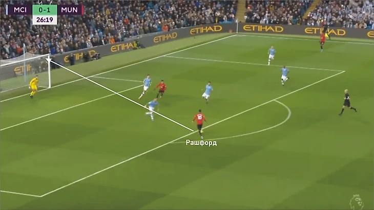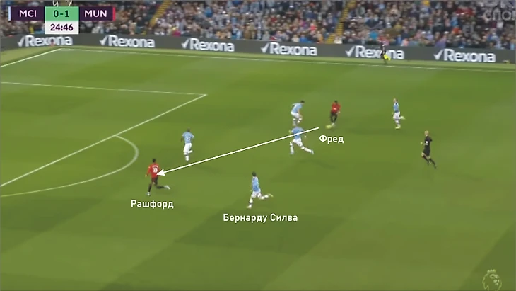 Фреда успели перекрыть, но с другой стороны уже свободен Рашфорд, а Бернарду Силва просто не смог так быстро вернуться за нападающим "МЮ". Рашфорд получил мяч и в касание пробил мимо ворот. Манкунианцы организовали контратаку грамотно, а главное быстро и дисциплинированно оказались в заданных точках.