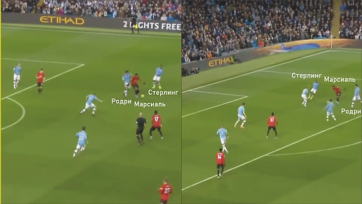 Рашфорд получает мяч почти в центре поля, Джеймс со всех ног мчится в свободную зону. Туда же смещается и Марсиаль. Следует точнейший пас вразрез. Обратим внимание на Родри, который не прочёл ситуацию и на данном кадре пока является зрителем.