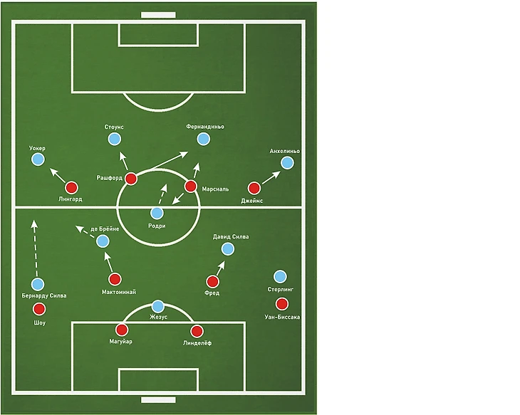 Оборона "МЮ" начиналась с действий нападающих, которые должны были своевременно перекрывать защитников, когда те начинали атаку. Поскольку при розыгрыше мяча от своих ворот Гвардиола не использует длинный пас, вовремя перекрытые защитники существенно тормозили атаки хозяев. При этом четвёрка нападающих "МЮ" не действовала строго по позициям, они часто менялись местами, дисциплинированно занимая зоны друг друга. Рашфорд был ближе к центральным защитникам, Марсиаль глубже. Как заметил, Бернарду Силва чаще уходил назад для получения мяча, чем Стёрлинг, а де Брёйне чаще, чем Давид Силва. Полагаю дело более в том, что Стёрлинг более атакующий футболист, который защищается или с меньшим желанием, или по указанию тренера, а Давиду Силве, к слову, уже 33 года, а вот де Брёйне как раз отличается высочайшей работоспособностью. Так или иначе, Мактоминай и Фред (менее успешно) действовали в своих зонах против де Брёйне и Давида Силвы, встречая их в своих зонах. Игроки "МЮ" действовали зонально и очень дисциплинированно. При такой обороне особую роль у хозяев должен был сыграть Родри, однако он не показал нужную мобильность при розыгрыше мяча, а при обороне, как увидим позже, ещё и допустил грубые ошибки.