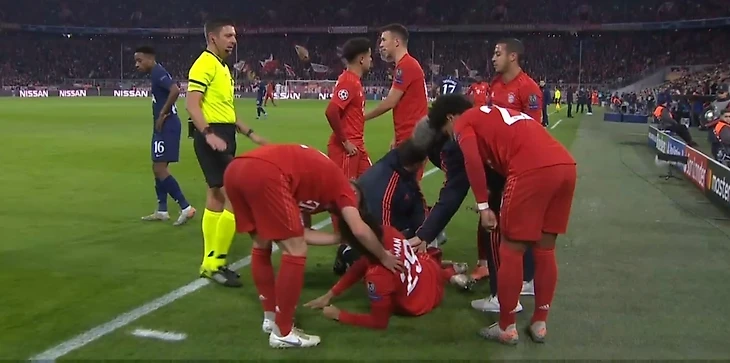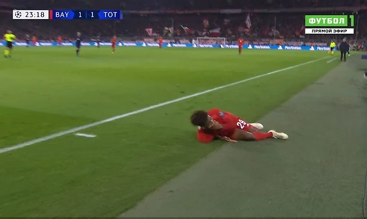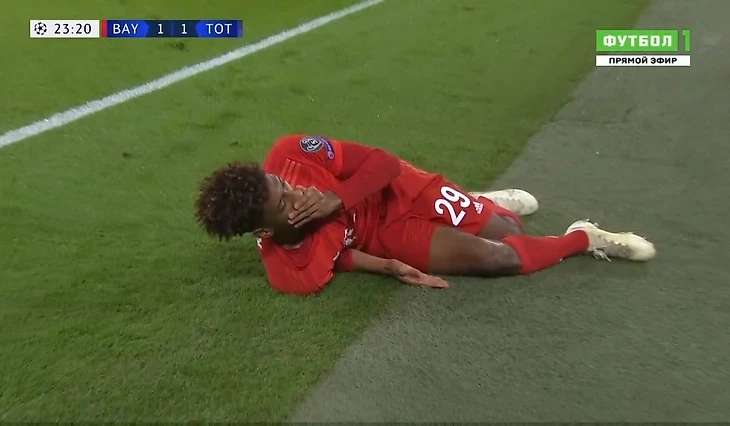 Как это было: Коутиньо из центра поля забросил мяч на фланг, Коман побежал за ним, почти достал, но на полном ходу неудачно ковырнул газон. А потом второй ногой подбил воткнувшуюся, подлетел, упал за линию поля и закрыл лицо руками.