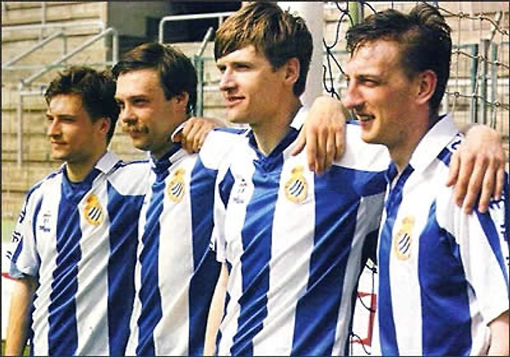 Пишу эту статью, пока ЦСКА побеждает в гостях Эспаньол. Многие знают или помнят как ЦСКА выбил Барселону из первой Лиги Чемпионов в 1992 году. Намного меньше тех, кто знает или помнит о том, что связывало армейцев и другой клуб Каталонии в те же годы. Так получилось, что в 1992 году в Эспаньоле оказались сразу 4 (!) игрока из ЦСКА. Слева направо: Игорь Корнеев, Андрей Галямин, Андрей Мох, Дмитрий Кузнецов.