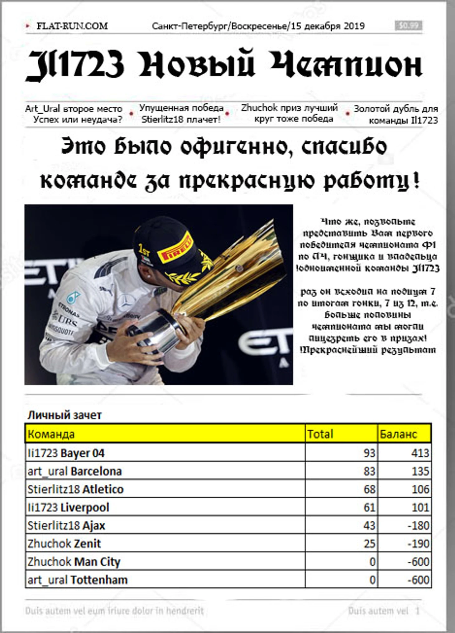Что же, обещал я, обещал и наконец то, сел за подведения итогов Чемпионата Формулы 1 по Лиги Чемпионов Flat Run.