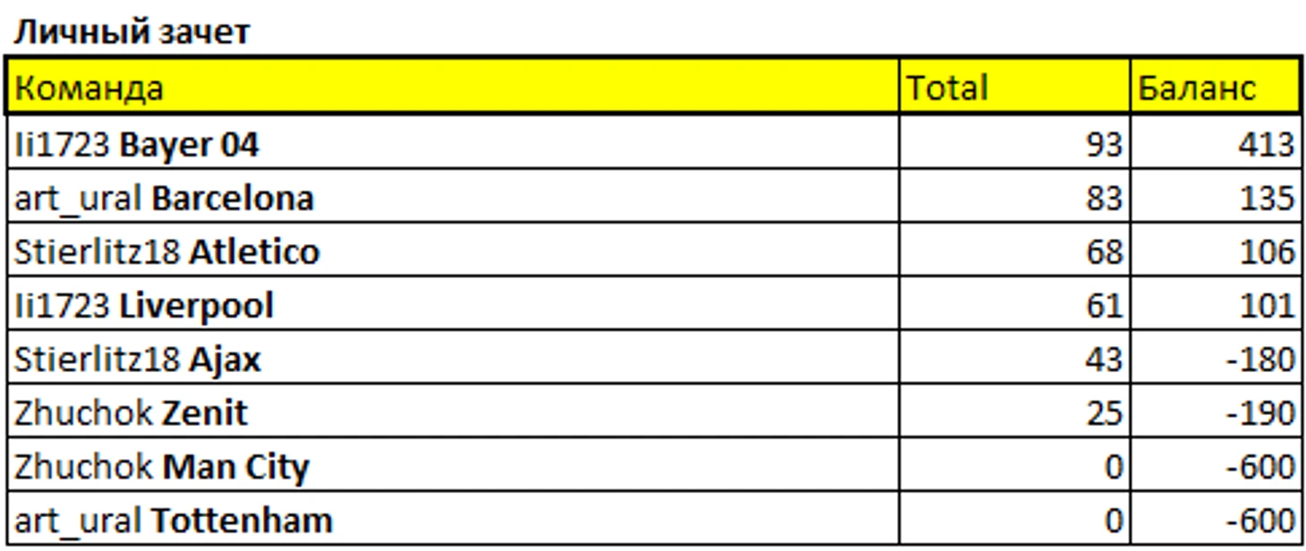 Ну вот собственно и все. Таким выдался Первый Турнир по ЛЧ, по правилам Формулы 1. Надеюсь всем понравилось и кто то захочет вновь сразится за Главный трофей! Было интересно.