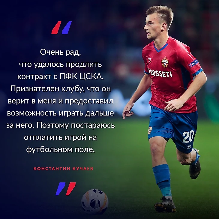 «Очень рад, что удалось продлить контракт с ЦСКА. Признателен клубу, что он верит в меня и предоставил возможность дальше играть за него. Поэтому постараюсь оплатить игрой на футбольном поле», — цитирует слова Кучаева пресс-служба «красно-синих».