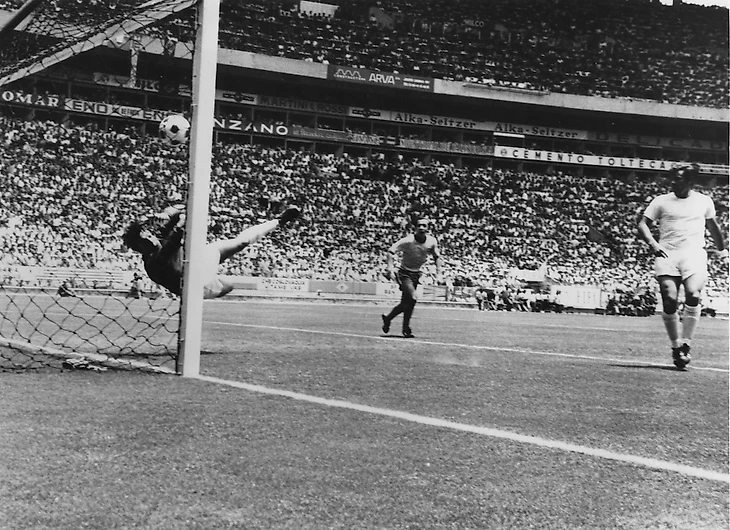 Английский вратарь Гордон Бэнкс немыслимым образом спасает ворота от мяча, посланного бразильцем Пеле во время матча первого тура чемпионата мира в Гвадалахаре, Мексика, июнь 1970 года.