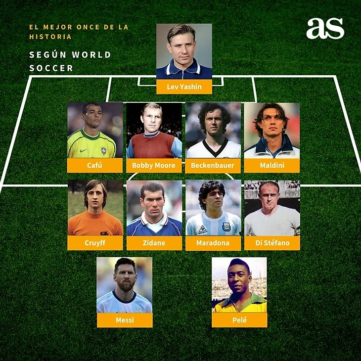 Лев Яшин (СССР) — Кафу (Бразилия), Бобби Мур (Англия), Франц Беккенбауэр (ФРГ), Паоло Мальдини (Италия) — Йохан Кройфф (Голландия), Зинедин Зидан (Франция), Диего Марадона (Аргентина) — Альфредо Ди Стефано (Аргентина) — Лионель Месси (Аргентина), Пеле (Бразилия).
