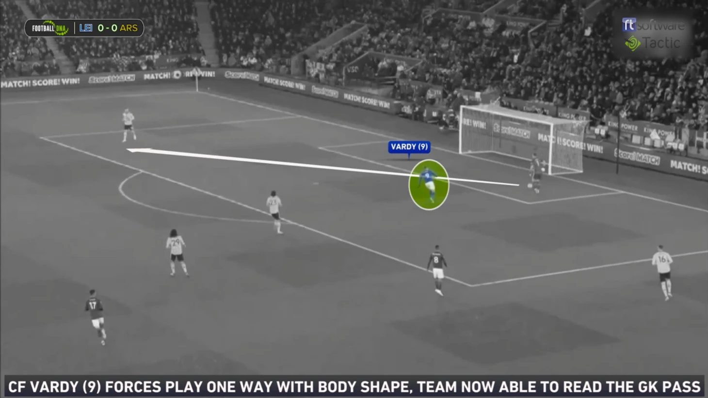 Теперь Варди выжидает правильный момент для прессинга – в зависимости от соперника он разный. Частый пример – небрежный пас защитника назад или поперек.