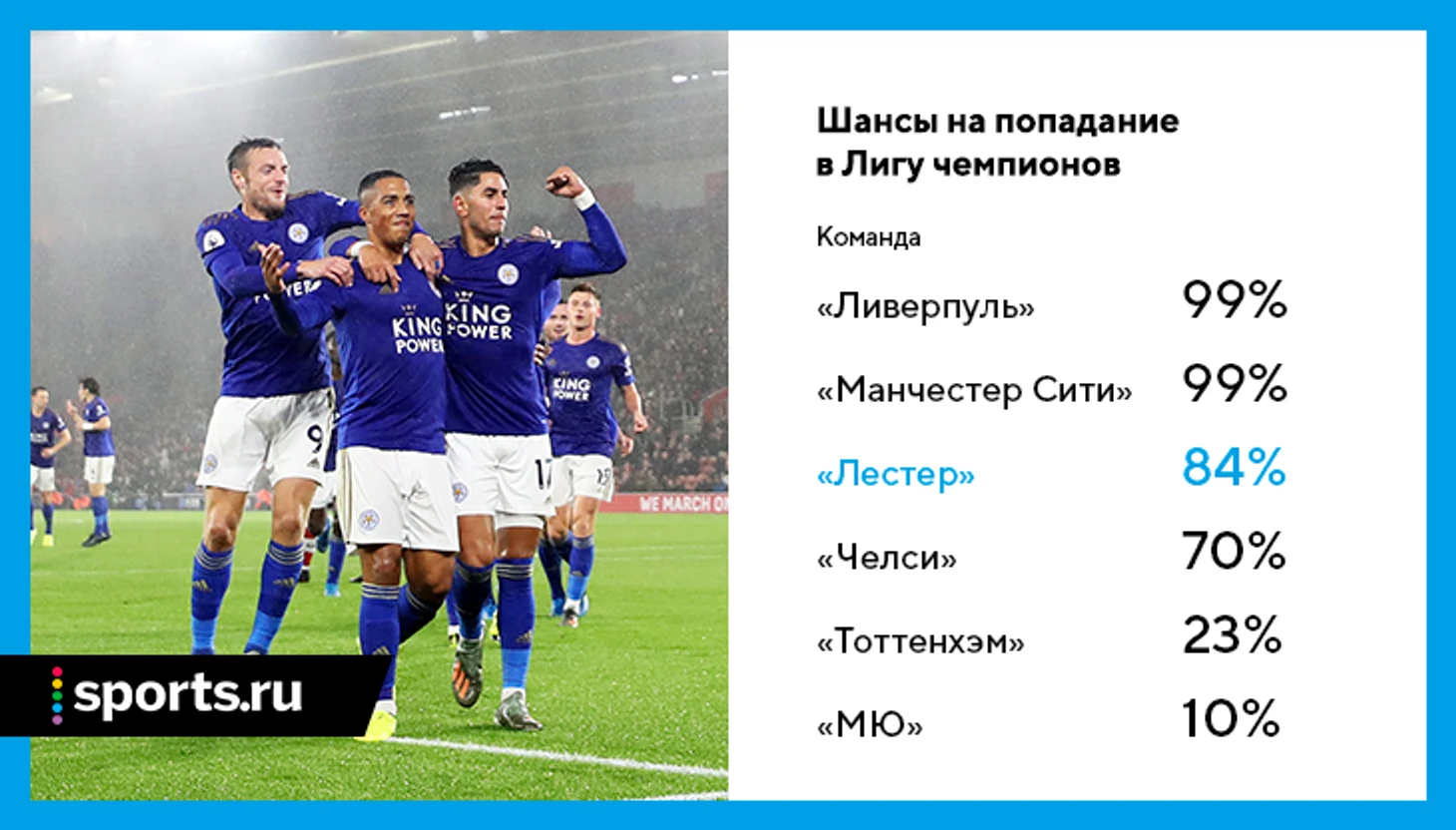 Это команда уровня Лиги чемпионов. В зависимости от того, какие параметры использовать, качество игры «Лестера» можно оценить как третье или четвертое в АПЛ. Прибавим к этому очковый задел, который уже создан – получаем практически гарантированное место в четверке в любых проекциях. Так, например, выглядит вариант от FiveThirtyEight: