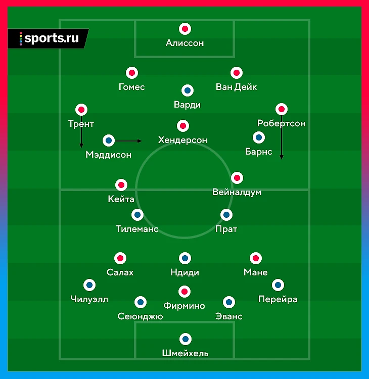 1. Брендан Роджерс выбрал прагматичную версию состава. Отличие от полностью основного варианта – расположение Джеймса Мэддисона на левом фланге. В трудных матчах тренер «Лестера» предпочитает закрывать центр более дисциплинированными игроками. Это открыло дорогу в старт Деннису Прату, а на скамейке оказался Айосе Перес.
