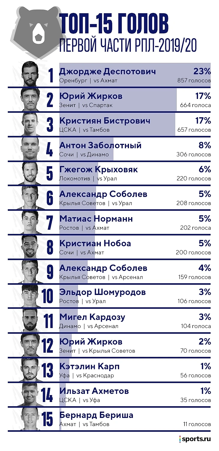 Если вы пропустили: авторы Sports.ru Александр Дорский и Глеб Чернявский выбрали топ-15 голов первой части РПЛ, после чего мы запустили голосование за лучший гол.