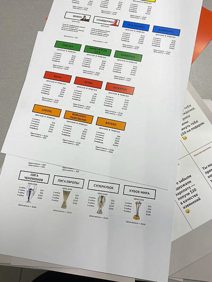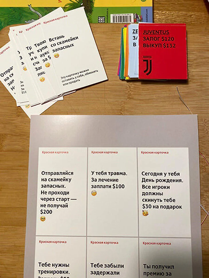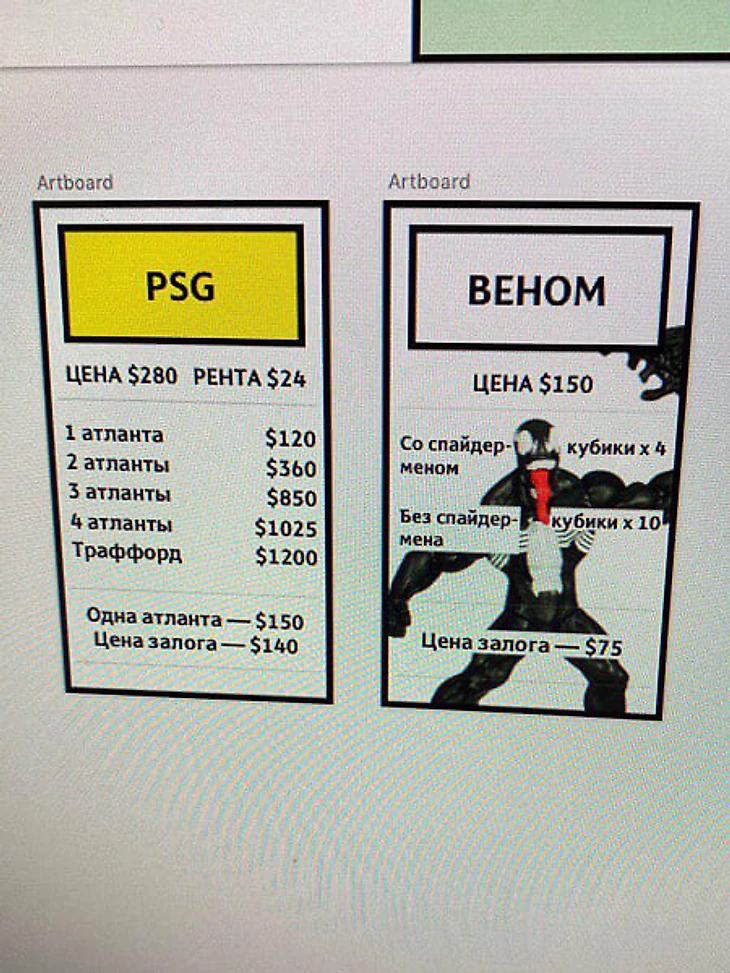Вместо улиц — клубы. Цвета — чемпионаты. Вместо железных дорог — кубки. Что делать с водопроводом и электростанцией, самыми бессмысленными карточками? Такого вопроса не стояло, потому что Яша, совершенно не интересующийся футболом, потребовал, чтобы в игре были Спайдермен и Веном. Так что бессмысленным карточкам — абсурдное применение.