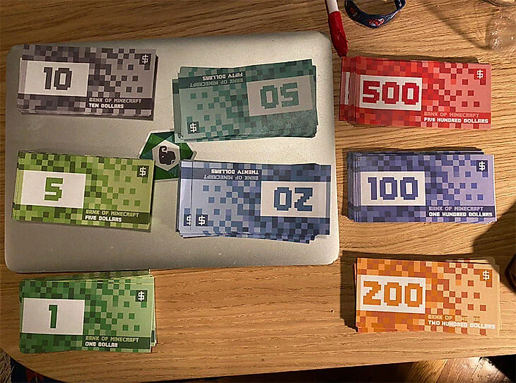 Ах да, деньги! Еще один мешап: дети обожают майнкрафт, скачали майнкрафт-деньги, дорисовали купюры в 200 и 500 — и тоже в типографию (в результате оказалось, что деньги печатать дороже всего).