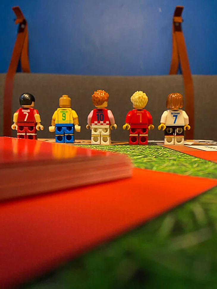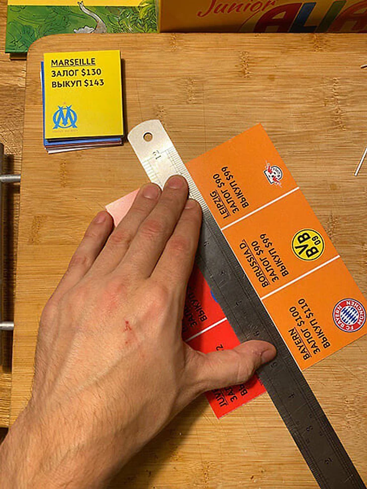 Короче, вы можете догадаться, что я и моя жена Катя смотрим на все это с некоторым подозрением, но увлечение поддерживаем, и когда полтора месяца назад Лева пришел к Кате и предложил сделать Монополию, Катя сказала — она должна быть футбольной. И карточки там должны быть желтая и красная. И немедленно заказала поддельные лего-фигурки футболистов (Месси, Роналду, Модрич и почему-то Бекхэм с Роналдо) на Алиэкспрессе.