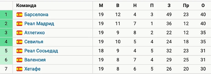 По итогам первой части сезона в турнирной таблице Ла Лиги лидирует «Барселона», набравшая 40 очков.