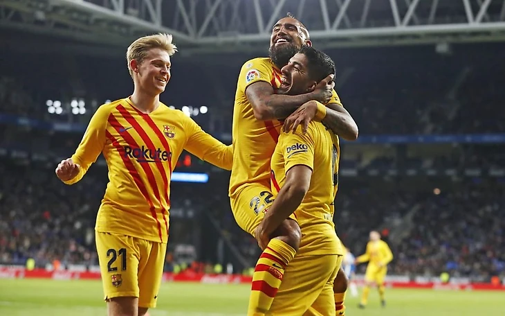 А теперь уже Видаль оседлал Суареса и они вместе с Де Йонгом радуются второму голу Барсы