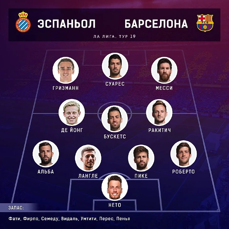 На матч против «Эспаньола» Эрнесто Вальверде выпустил такой состав. В рамке ворот вышел Нето, бразилец дебютировал в этом розыгрыше Примеры, так как Тер Стеген залечивает травму колена. Слева в защите вышел играть Альба. В центре пара основных Пике-Лангле, а справа вышел Роберту, все таки испанец выигрывает конкуренцию за место именно на фланге защиты. В центре поля в опорной зоне сыграл Бускетс, ближе к флангам располагались Ракитич и Де Йонг , справа и слева соответственно. А в атаке уже привычное трио Месси-Суарес-Гризман с уругвайцом на острией и аргентинцем и французом по флангам. Хотя, сказать, что Месси вышел играть чистого правого вингера - это смешно. Позиция Лео там, где он захочет.