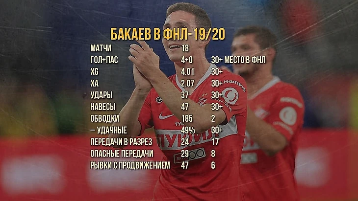 Возникает закономерный вопрос: что же суперталант не вызывается в сборные и даже не привлекается к основе? Справедливый вопрос? А то! И на него вам не ответят даже каждый второй из каждого второго, кто Бакаева в деле видел. Ниже – табличка с показателями в этом сезоне ФНЛ. Основной игрок (18 матчей), игрок группы атаки имеет жуткие цифры. Единственный плюс – 11,1 обводка за 90 минут, лучший показатель в ФНЛ. Правда, удачные – 49% – и это, мягко говоря, мало.