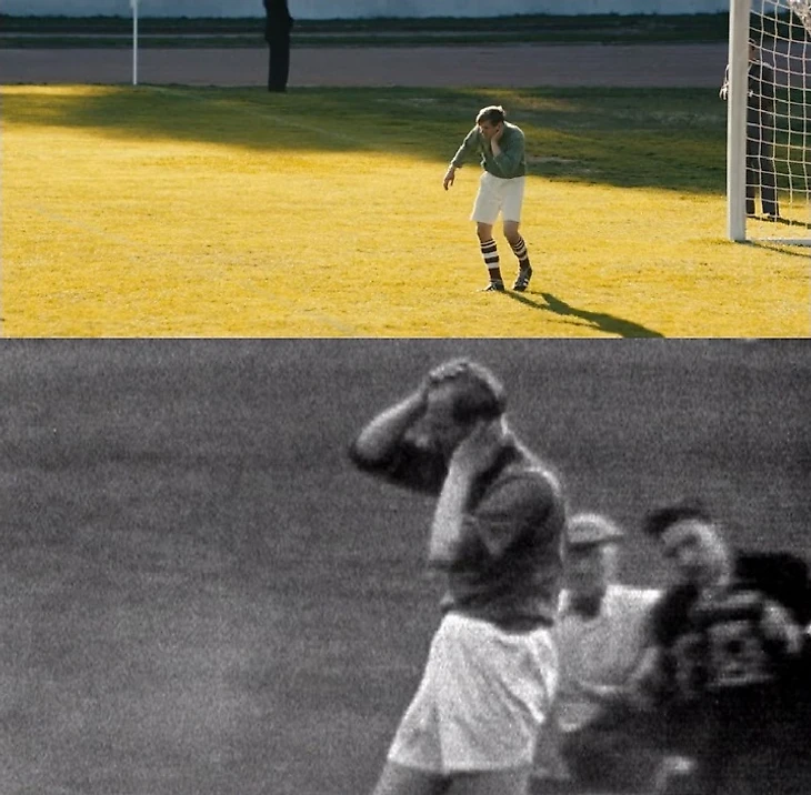 Сцена с игрой на «Уэмбли» в финале Кубка Англии 1956 года занимает около 10 минут, и должна была стать одним из самых напрягающих моментов фильма. Показать ужас случившегося и шокированное состояние Берта на поле. «Нашатырь, адская боль и решение остаться на поле», – так написано в том блоге? Передано было это не так впечатляюще – Берт просто держался за шею до конца игры, делая сумасшедшие сэйвы. Вот уход в раздевалку и страшное падение – этот кадр просто великолепен, хоть и идет ровно секунду. Ведь когда ты ломаешь шею и держишься на грани жизни и смерти, то это и должно выглядеть так. Но, но… Хотя, сказать честно, так оно и было - если судить по фото с матча, то передано всё было правдоподобно, вплоть до позы с приложенной к шее руке.