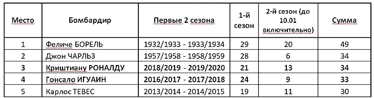 Следующий рекорд, который пытается покорить Роналду, – это рекорд скорострельности в серии А для ювентини. Только 10 игроков «Ювентуса» в своих первых двух сезонах в сумме забили больше чем звёздный португалец. Однако нынешний сезон ещё не закончен, и Роналду сможет увеличить свой бомбардирский багаж. Для объективности приведём список лучших бомбардиров «Ювентуса» в серии А по состоянию на 10 января второго для себя сезона. И в этом реестре CR7 второй: