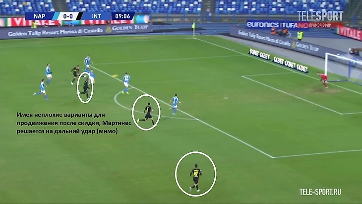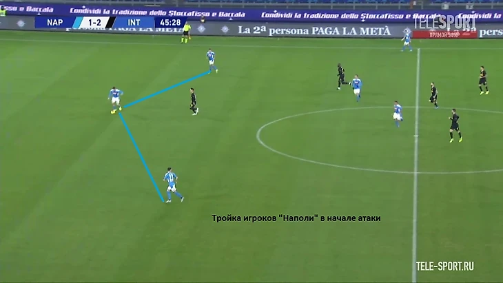 Контратаки стали приятным дополнением, ведь Лукаку и Мартинес те самые нападающие, которым только дай мяч и свободное пространство. Фактически, первый мяч был забит с контратаки (потеря мяча после падения игрока), в некоторых ситуациях перспективные выпады не завершались ударом из-за несогласованности действия нападения. Контроль контратак- большая проблема неаполитанцев первом тайме, контрпрессинг проходил не всегда и любой отрыв мог завершиться моментом. Но, оценивая игру хозяев, всё-таки нужно обратить внимание на потери- в начале я уже перечислили список травмированных, в защите ситуация дошла до такой степени, что правому защитнику Ди Лоренцо пришлось выйти в центре. Продвижение мяча в связи с этим не клеилось, мало что создали кроме дальних ударов, хотя прессинг работал относительно неплохо. Стоит всё-же отметить неплохую десятиминутку в конце тайма, когда удалось прижать гостей- сначала был момент у Инсинье, затем Бираги прозевал рывок Кальехона и Милик после прострела забил. "Наполи" вернулся в игру,но всё же соперник смотрелся лучше по итогу тайма.